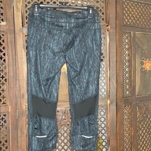 Athleta running leggings in black and grey 1 zip closure back pocket, infinity drawstring. Reflective at hips and cuffs for safety. Breathable lightweight compression