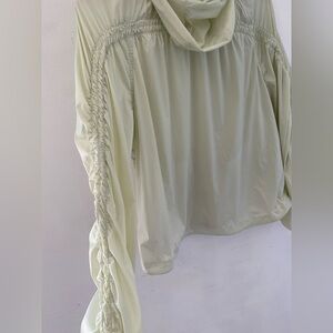 Light green windbreaker with hood. Features front zipper and drawstring. Perfect for outdoor activities. Excellent preowned condition open to offers