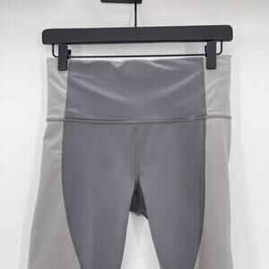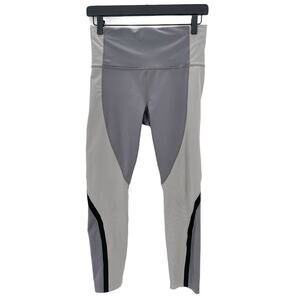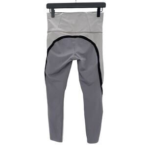 Gray color blocking with black stripe. 7/8 length. Size small. 2 waist pockets. Drawstring never ending in front. Faint mark on leg, side and butt. See photos. Good condition.