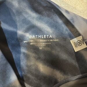 Like new! Athleta Salutation II Stash Pocket Tights women’s size medium. Moisture wicking performance material, high rise waist, light compression, pockets on sides of hips, navy print, skinny leg opening, 7/8 length- hits at ankle. Offers accepted!