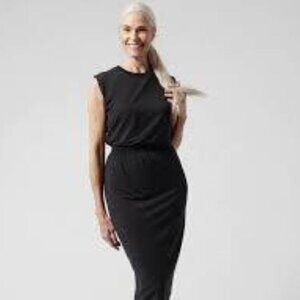 athleta dress, black dress, sleeveless dress, elastic waist dress, knee-length dress, women's athleisure, casual black dress, stretchy dress, women's size S, athleta clothing, versatile dress, soft fabric dress, professional dress, Goth, Witchy, punk, Leisure wear, Lounge dress