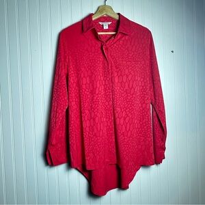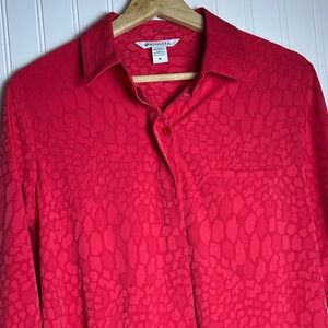Stylish red button down shirt. Long sleeves with a classic collar. Hidden Button up front with a placket, gusset underarm has holes for air venting. and slits on bottom of sleeves.