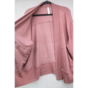 Athleta Short Sleeve Open Front Cardigan-Size S/M-Pockets-Oversized. The item is in Excellent Condition. The material is 69% Lyocell, 15% Cotton, 10% Modal and 6% Spandex. Laying flat measuring armpit to armpit it is 27.5'' and 27'' in length.