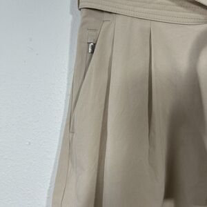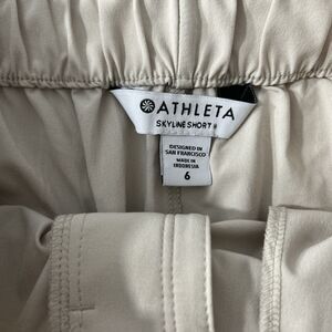 These Athleta Shorts for women in size 6 are a stylish and comfortable option for casual occasions or travel. The beige color and high-waist design with a paperbag style give them a trendy and minimalist look. Made from a polyester and spandex knit fabric, these shorts feature a tie closure, slash pockets, and a 3-inch inseam. Perfect for the summer and spring seasons, these athletic athleisure shorts are machine washable and easy to care for. Ideal for those who appreciate a blend of hipster, nature, festival, and bohemian themes in their wardrobe.