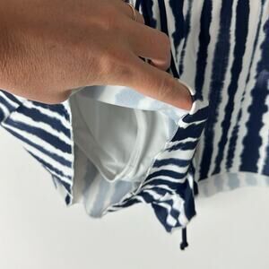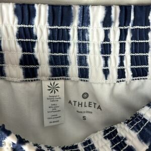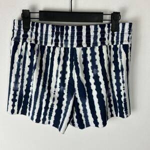 Gently Used Athleta Lined Shorts. These are a women’s small. White and blue vertical acid wash type stripes throughout. Built in liner. Drawstring elastic waistband. No pockets. 80% nylon, 20% spandex.