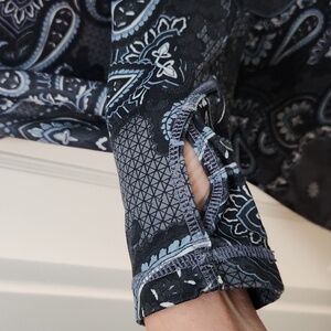 Decorative paisley pattern in dark and light blue colors.