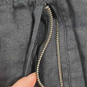 Please see photos 5, 6, and 7. The front left pocket zipper is partially detached from the pant (photo 5 and 6) but is still functional as a pocket