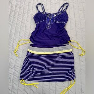 Top is 34 D/DD bottoms are Medium Great condition. The blue leaked onto the white but only in the inside on built in pads