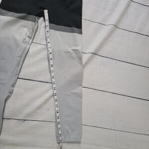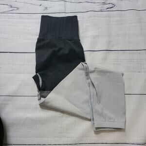 Sleek and modern, these leggings feature a wide high-rise waistband and bold black-to-gray colorblock design with subtle striped detail.