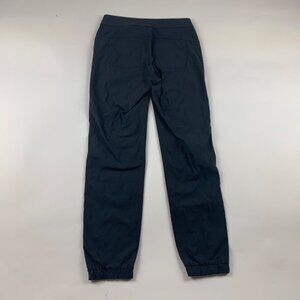 Excellent used condition, nylon stretch blend quick dry athletic pant has no notable signs of natural wear. 4 pockets, zip front, snap closure, elastic hems. Size 0, please reference measurements for sizing & fit inquiries.