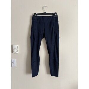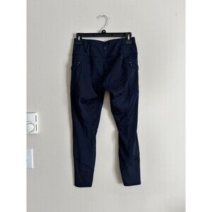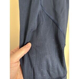 Women's Athleta leggings in a navy blue color. Capri length perfect for spring and summer. These have cutout panels of a different fabric with slightly sheer detail. Convenient zippered pockets. Tagged small. -Waist, relaxed: 13 inches across (26 inches overall). -Rise: 8.5 inches. -Inseam: 25 inches. Condition: Great! Worn previously. No stains or tears in fabric. Some distressing shown in last photo. Overall great! Smoke free, oet free. Please ask questions if you have any, thank you!