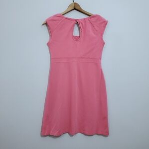 Pre-owned Athleta dress, size medium. It's made of an organic cotton/spandex blend fabric that's lightweight and stretchy, has a small zippered pocket at the waist, keyhole style in the back, and it comes in a pretty solid pink color. It's in excellent condition, no stains, rips, etc.