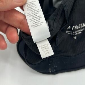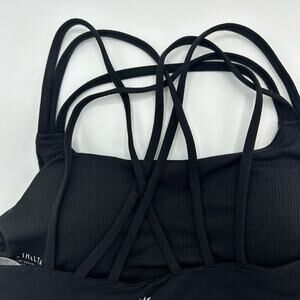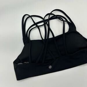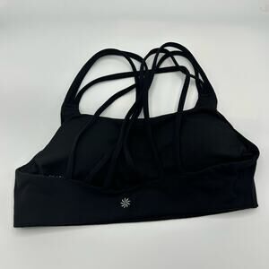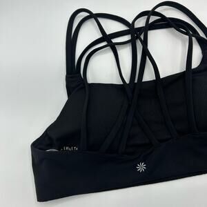 Sleek Athleta longline bra in classic black with a multi‑strap back and soft mesh lining for breathable comfort. Light-to-medium support with removable pads (if included) and a wide smoothing band—great for yoga, barre, and everyday athleisure.