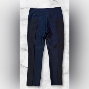Athleta Stellar pants leggings FEATURE two tone color combination of dark navy blue and black. Perforated side panels. Wide high rise waistband. Zipper side pockets. Cropped length with side vents. Pull on.