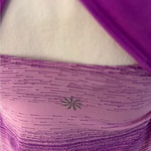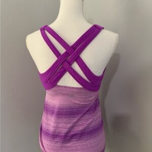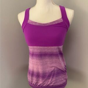 Bright pink/purple. Built in bra with light padding. Criss cross back. Perfect for all kinds of workouts!