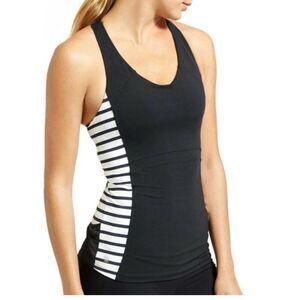 This tank aces performance and mobility with wicking & breathable fabric, a slim Y-back, and back stash pockets. Fitted 2 IN 1: Get the comfort of a tank and the support of a bra MEDIUM SUPPORT B - C MID COVERAGE. Lower cut neckline Color: black and white