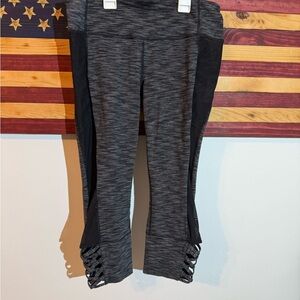 Chic striped leggings with Mesh down each leg in gray and black. Ideal for active or casual wear. Great Condition Size M New without tags