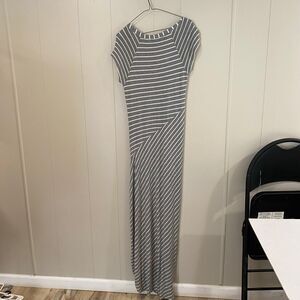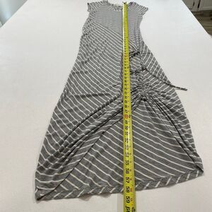 Athleta striped maxi dress in size Small. Soft gray and white stripe pattern with a flattering scoop neckline and ruched side detail that creates a subtle draped look. Super comfy, stretchy, and perfect for travel, errands, summer days, or layering with a denim jacket.