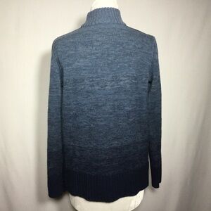 Athleta Sunset Merino Pullover Sweater. Size Small. Mock turtleneck with solid navy blue stripe down shoulder and sleeves. Light blue to dark blue. 100% extra fine merino wool.