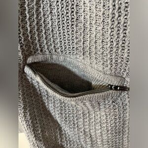 Light gray knit sweater cardigan, 5 snap buttons, two zip pockets on the front