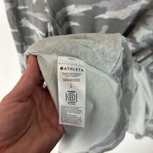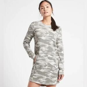 Gently Used Athleta Camo Luxe Balance Dress Crewneck Sweatshirt. This is a women’s large. Light green and grey camo pattern throughout. Lighter weight and super soft. Two front pockets. Longer dress like length. Style S/982685.