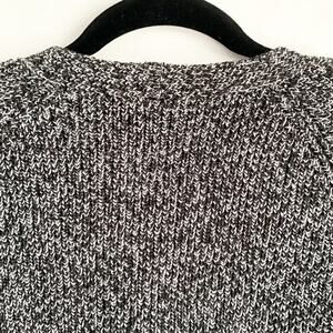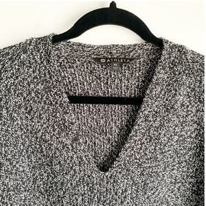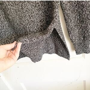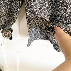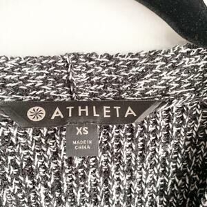 Athleta V-Neck Switchback Merino Wool Blend Side Vent Relaxed Knit Marled Sweater Size XS. Black and white marled knit. Care tag has been snipped out, but material contents are listed next from Athleta's website from item listing. 55% polyester and 45% fine merino wool. Machine wash. Dry flat. Good, preowned condition. Side vents in each side make it perfect for leggings.