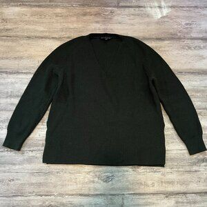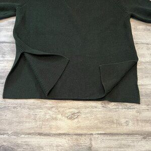 The Athleta Switchback has a roomy, relaxed fit, and a CYA length. Chunky knit Thermolite fiber and merino wool blend is warm, moisture-wicking, and breathable. V-neckline, ribbed cuffs, and side slits at the hem. Color is called "Black Olive," which is actually a gorgeous deep green. Size Small, with an oversized fit (could easily fit a medium).