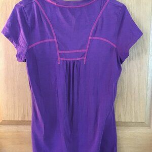 Athleta T Shirt, Purple with red stripe, scoop neck, short sleeve logo on bottom right Large 56 60% Cotton 38% Polyester 6% Spandex