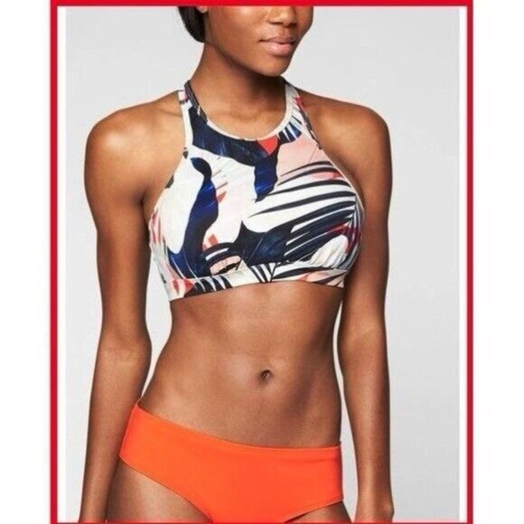 Athleta Tahitian Tropical Red Blue High Neck Swim Bikini Top Underwire Sz 32 B/C. Pre-owned in great used condition.
