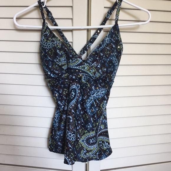 Athleta Tankini. Size 2. Underwire bra. Teal blue with brown and black paisley print with gold foil in the design