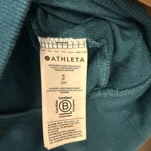 Super soft and beautiful teal color Athleta sunrise long-sleeve top in small petite. See pics!! Small bleach stains on one cuff and sleeve. Cuff can be rolled to avoid showing it, but small stain still visible on sleeve. So bummed because it is otherwise in great condition!