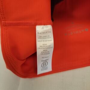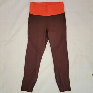 These Athleta Tenacity 7/8 Tight leggings feature a maroon and orange colorblock design with mesh detailing.