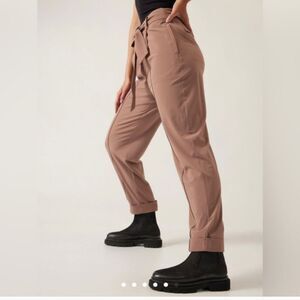 Rustic Beige colored Athleta Cardiff Pant. Straight Leg wrinkle resistant sits above the natural waist. Good for work travel and commute. Secure zip side and back pockets. Attached belt moisture wicking breathable quick dry silky feel pant.