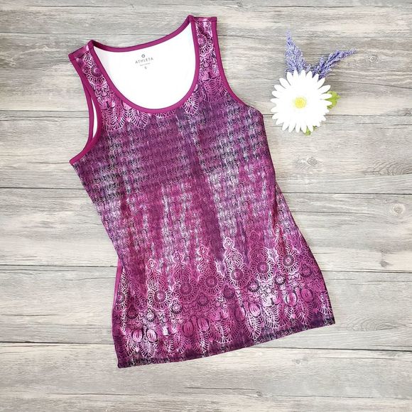 Athleta Purple tie die mandala print athletic tank top. Fitted. Great workout top. True to size. This item is in excellent preowned condition. Ready to wear.