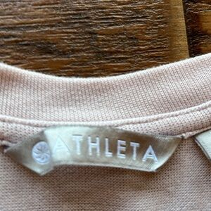 A relaxed fit blush top with a crew neck featuring long sleeves. Bottom has crossover accent, armpit to armpit approximately 22” across, approximately 25” long with slightly shorter at bottom middle, soft and comfy, lightly worn
