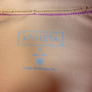 The Athleta top is a women's size S orange long sleeve shirt with a 1/4 zip closure, perfect for casual occasions. Made of nylon and spandex, this stretchy top features a solid pattern, high neckline, and a classic fit. Ideal for tennis or outdoor activities, this knit fabric top is comfortable and stylish, making it a versatile choice for the winter, fall, and spring seasons.
