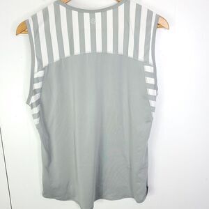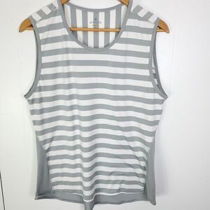 The gray Athleta tank top is a sleeveless garment with a round neckline and a pullover closure. It is made of a lightweight blend of polyester and spandex, suitable for active occasions during the summer, fall, and spring seasons. The striped pattern adds a touch of style to its basic design, perfect for an athleisure look. The size is L and it is machine washable for easy care.