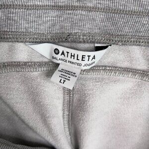 This Athleta track suit set includes a printed Balance Hoodie jacket and matching Balance Jogger pants in a gray leopard print. The jacket features a hood, full zip, and thumb holes, while the pants have a drawstring waist, pockets, and a tapered leg. The pants are a Large Tall (LT) size.