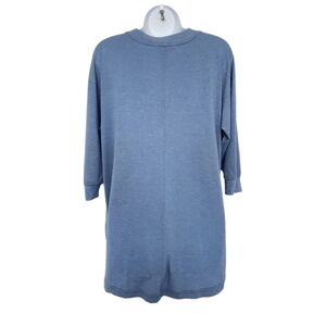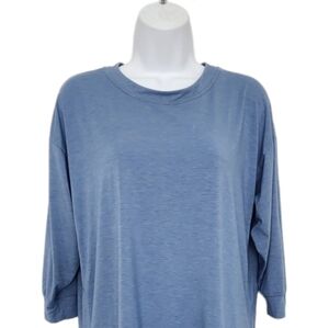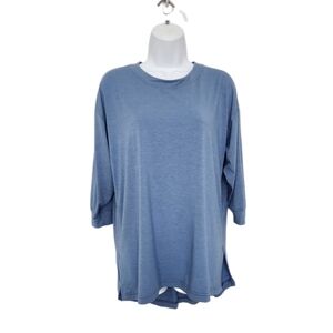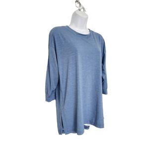 This Athleta Tranquility tunic top XS relaxed fit, like a size Small/Medium with an OVERSIZED design it is perfect for casual occasions or even activewear. The top has a 3/4 sleeve length and a round neckline with a pullover closure. The heritage blue color and light fabric wash make it a great option for summer, fall, and spring.