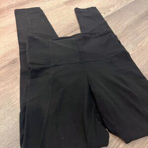 These pants have been worn a couple of times and have minor peels, no rips, or stains! There is a little lint that needs to be rolled off. Below is the listed Athleta description of materials. Please let me know if you have any questions!