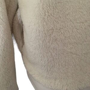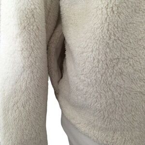 This Athleta cozy Sherpa is unbelievably soft warm thick Teddy coat it has thumb holes long sleeves, ribbed cuffs and waistband, two side pockets, black and cream drawstrings