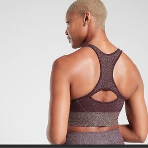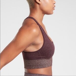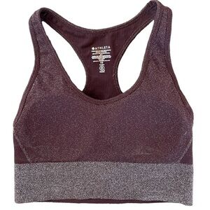 Cute sparkly bra from Athleta in a deep burgundy color. Size XS. Removable cups and a racerback. Red marker through brand info, but no visible exterior flaws.