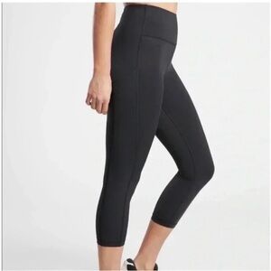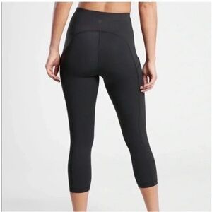 Athleta black ultimate stash pocket capri leggings. Good used condition, light pilling of the seam in the crotch, no holes or odors.