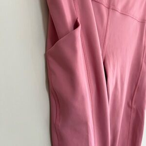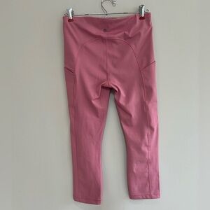 Athleta Ultimate Stash Pocket Capri Leggings in a very pretty pink called "Antique Rose". They are a size medium and are in good preowned condition. The interior tag has been cut out, and there are two pulls on the back of the pant + one scuff (see photos).