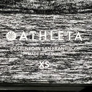 Athleta branded Uptempo style lightweight hooded sweatshirt with long sleeves, thumb holes, surplus/cowl neckline, rounded hem with side slits for moveability, heathered grey and black color. Unsure if this was originally supposed to come with a drawstring or not.