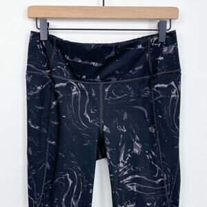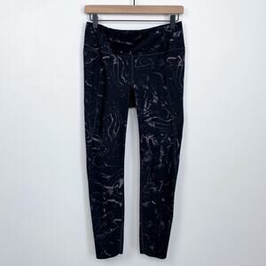 Small Athleta Velocity Stash Pocket Marble 7/8 tights. Black marble print, lightweight athletic fabric. Side pockets. Back zipper pocket. Interior drawstring. 7/8 ankle length. No flaws, great condition!