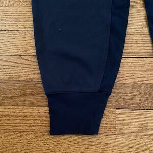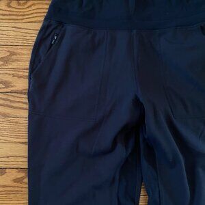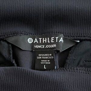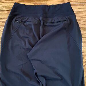 The Women's Athleta Black Jogger Pants have two pockets in front, and two zippered pockets in the back. It has a two inch ribbed band in the waist and on the cuff of each leg. The Venice Jogger is slightly heavier than some of the other Athleta pants. It is in great shape and it is also extremely comfortable to wear. I would not be selling these pants other than after having lost 30+ pounds, these pants simply don't fit me anymore.