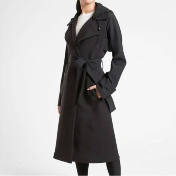This is the Athleta Voyage Long Line Trench Coat in black, size 12, complete with the original belt and attached hood. One of my favorite coats ever – only selling because it no longer fits me!