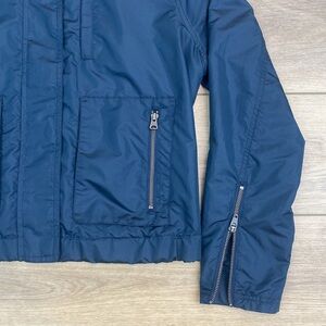 Navy Blue lightweight Water Resistant packable Hood zip up windbreaker by Athleta. Three front zipper close pockets and zipper cuffs. One small scuff on the back of the right sleeve as pictured, overall excellent condition. Women’s size Large L