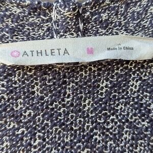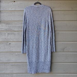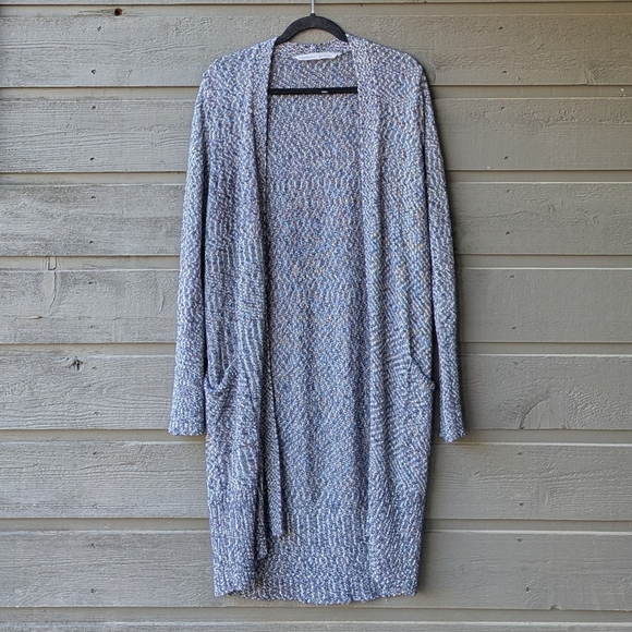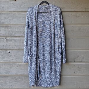 Excellent preowned condition open front Weekend Wrap long line cardigan duster from Athleta. Marled navy blue and white knit. Long sleeves. Oversized pockets. Relaxed fit. 81% cotton 19% polyester. Machine washable. Clean. No flaws.